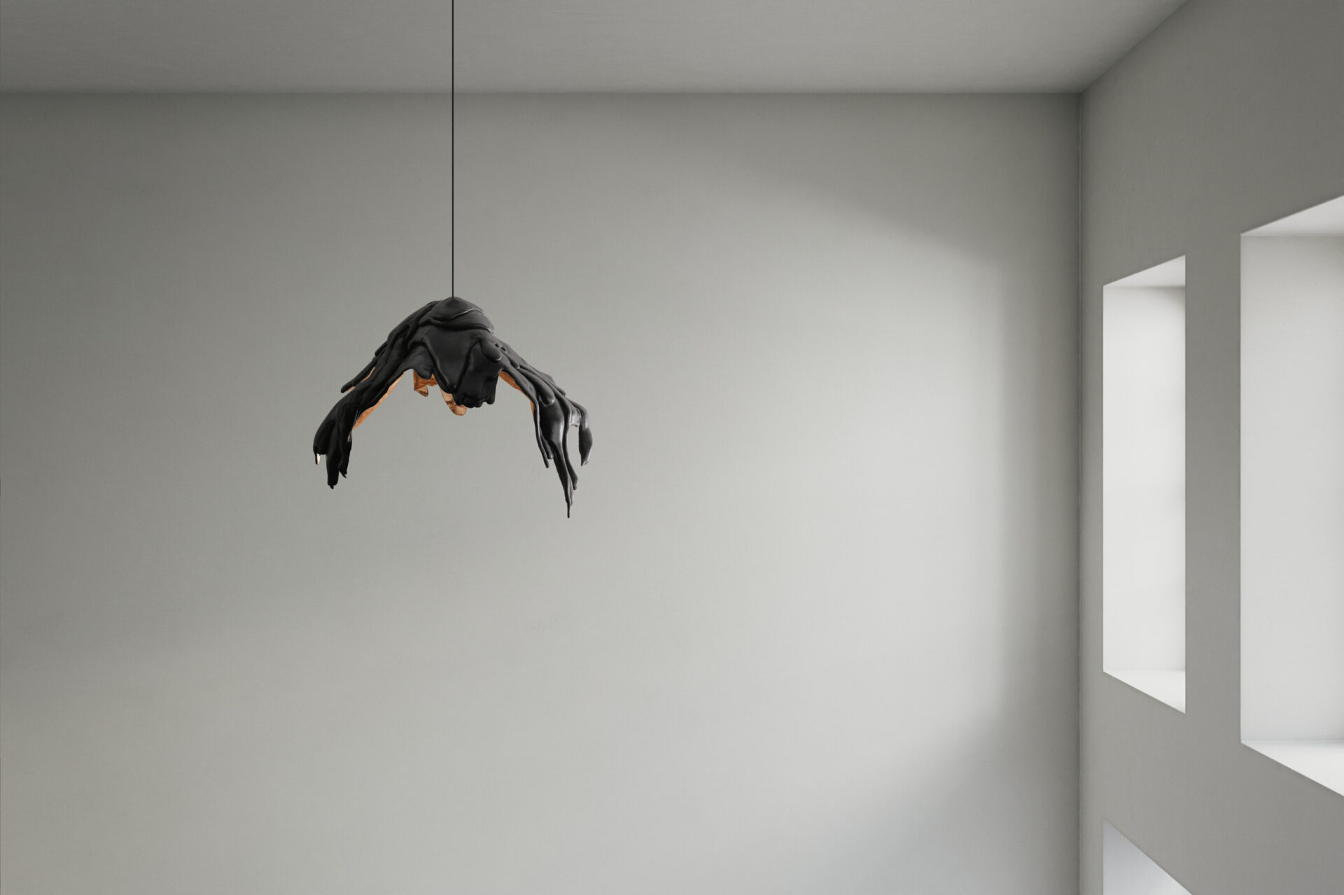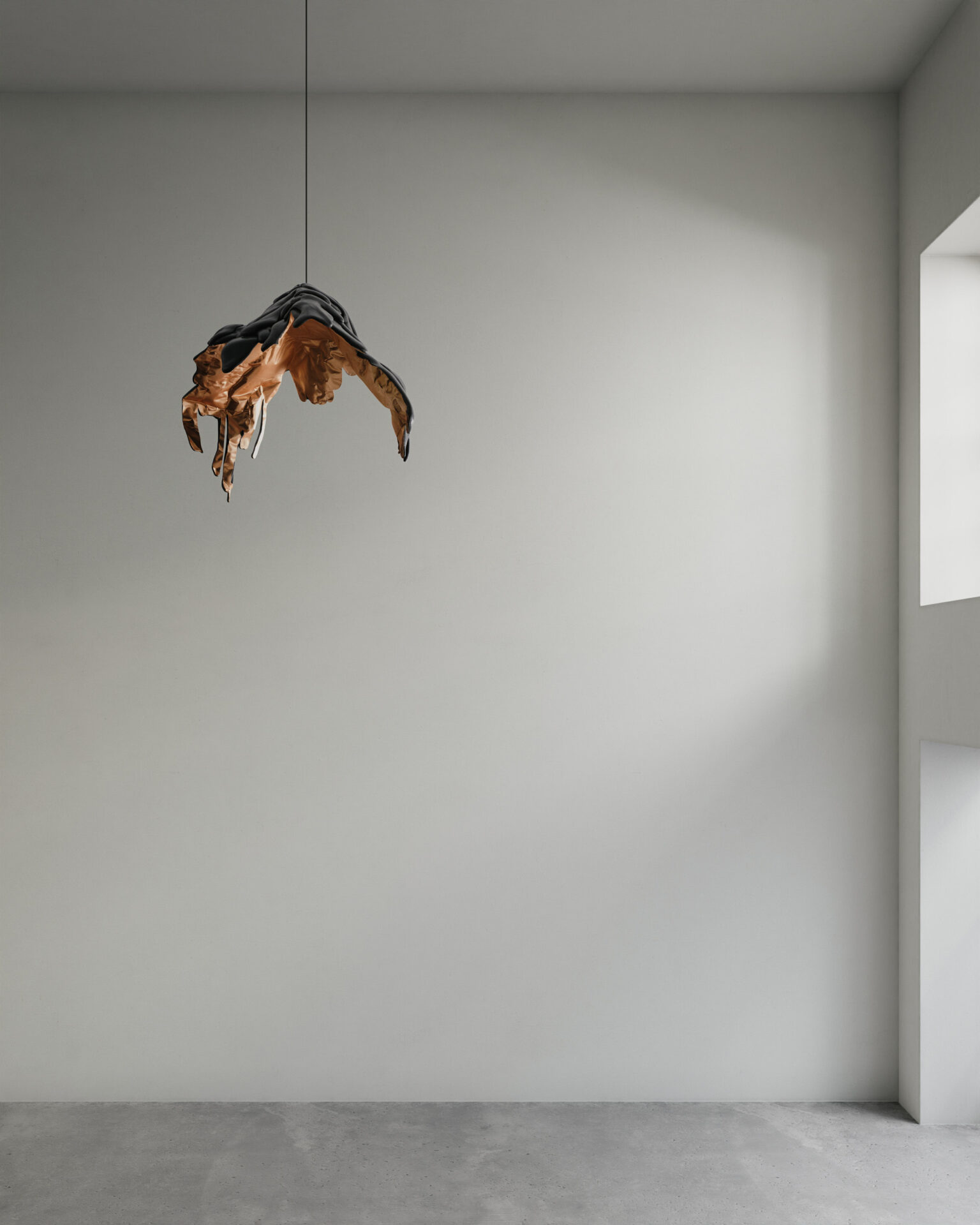 Capturing a feeling of heat – evoked in the black crust and molten gold interior – Siso brings to mind liquid tar or volcanic lava flows. When illuminated, the temperature rises further, emitting a hot glow from within.